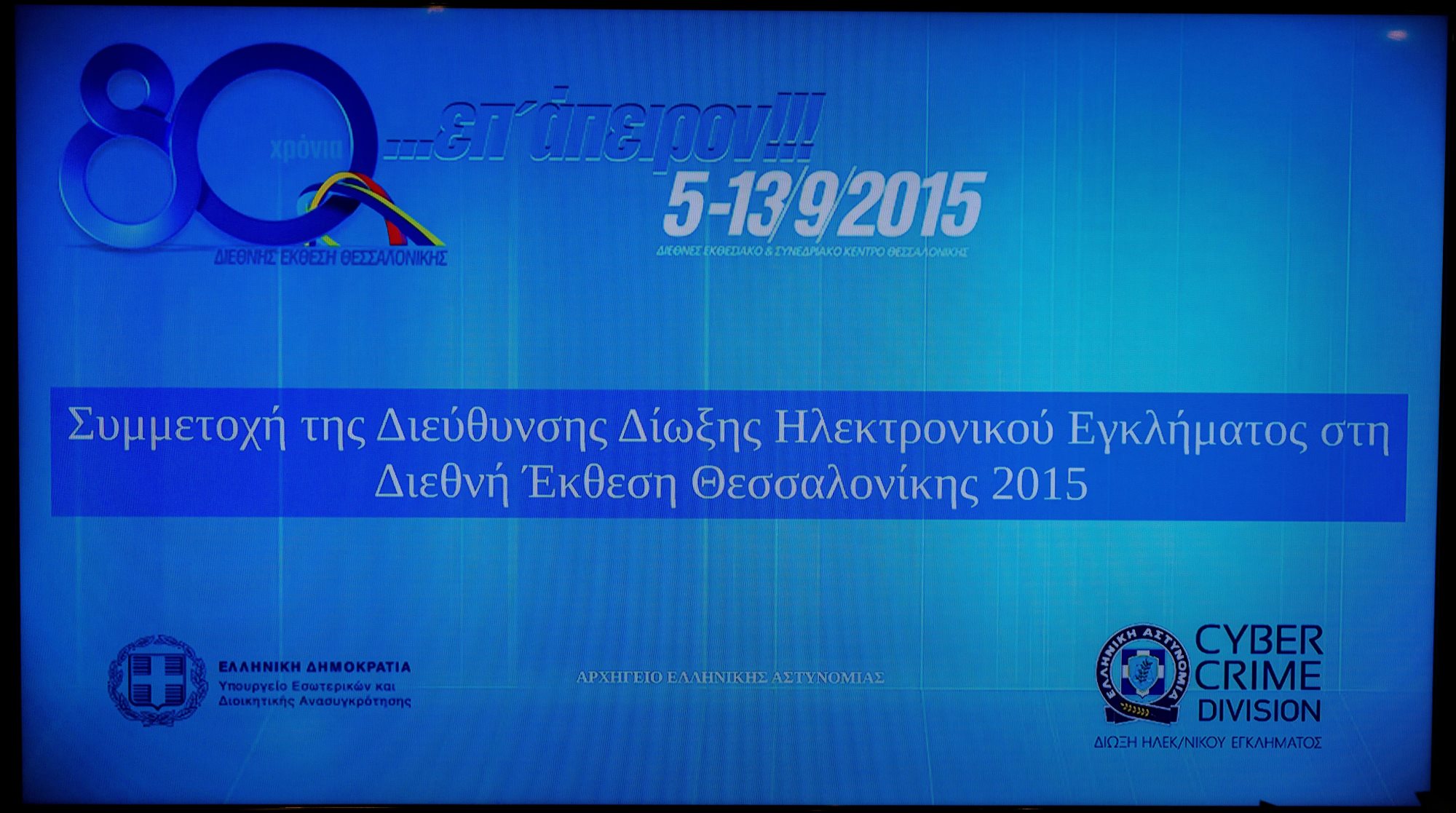 Συγκεκριμένα, στο πλαίσιο της Διεθνούς Έκθεσης Θεσσαλονίκης 2015 (από 5 έως 13-09-2015) η Ελληνική Αστυνομία θα λειτουργήσει πληροφοριακό κέντρο (περίπτερο), στο οποίο θα παρουσιάζονται: α) από τη Δίωξη Ηλεκτρονικού Εγκλήματος η πλατφόρμα καινοτόμων δράσεων « FeelSafe» με κεντρική θεματολογία το ηλεκτρονικό εμπόριο μέσω ασφαλούς χρήσεως πιστωτικών και χρεωστικών καρτών και β) δραστηριότητες άλλων αστυνομικών υπηρεσιών.