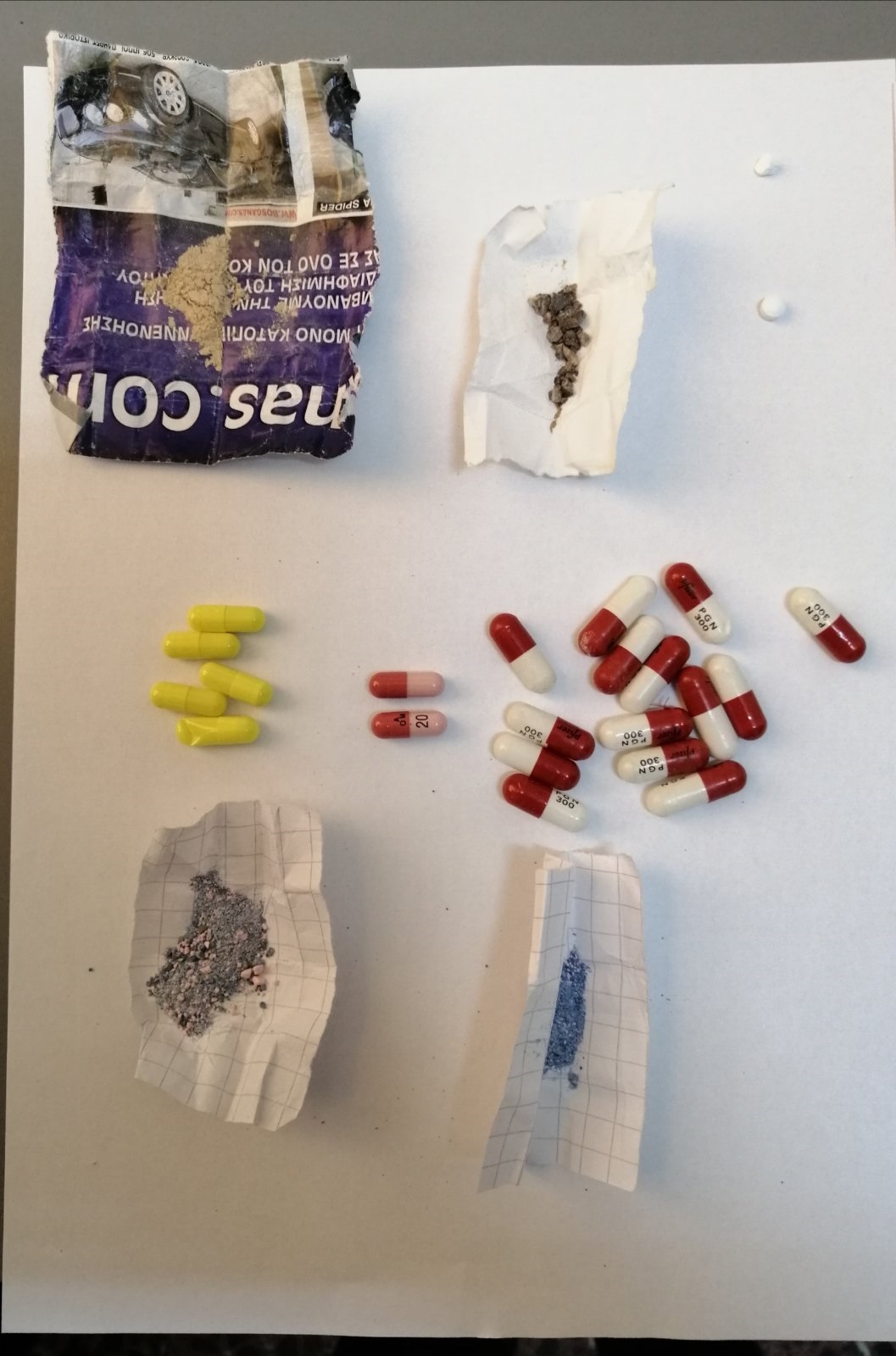 Κατά τη διάρκεια της έρευνας βρέθηκαν και κατασχέθηκαν μικροποσότητα ηρωίνης, αυτοσχέδιο μαχαίρι, αυτοσχέδιο σουβλί, (21) κάψουλες και τρίμματα άγνωστων ψυχοφαρμάκων και (2) χάπια