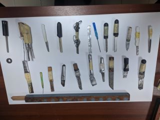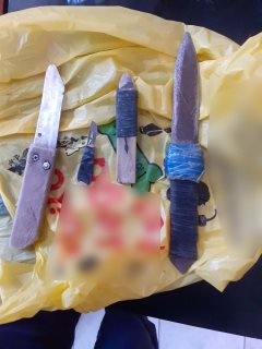 - (2) μαχαίρια, αυτοσχέδιο σουβλί, (2) φαλτσέτες και (2) αυτοσχέδια ξυραφάκια,
