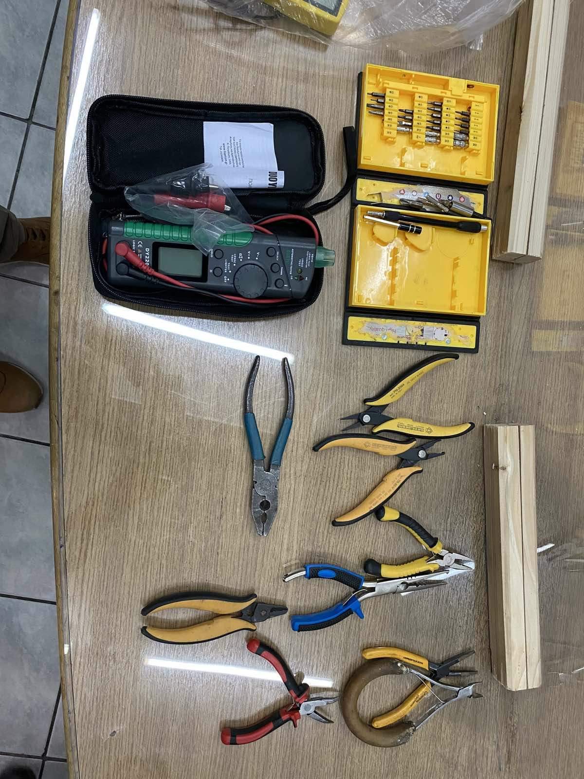 - διάφορα εργαλεία (λίμα, σφυρί, κάβουρας, (2) καλέμια, (6) κατσαβίδια, μύτες κατσαβιδιών, μέτρο, (2) μπουλόνια, μύτη από τρυπάνι, (9) τσιμπίδες, πένσα, πολύγωνο κλειδί, μυστρί, (7) σπάτουλες, μηχάνημα συγκόλλησης και μεταλλικές σφήνες)