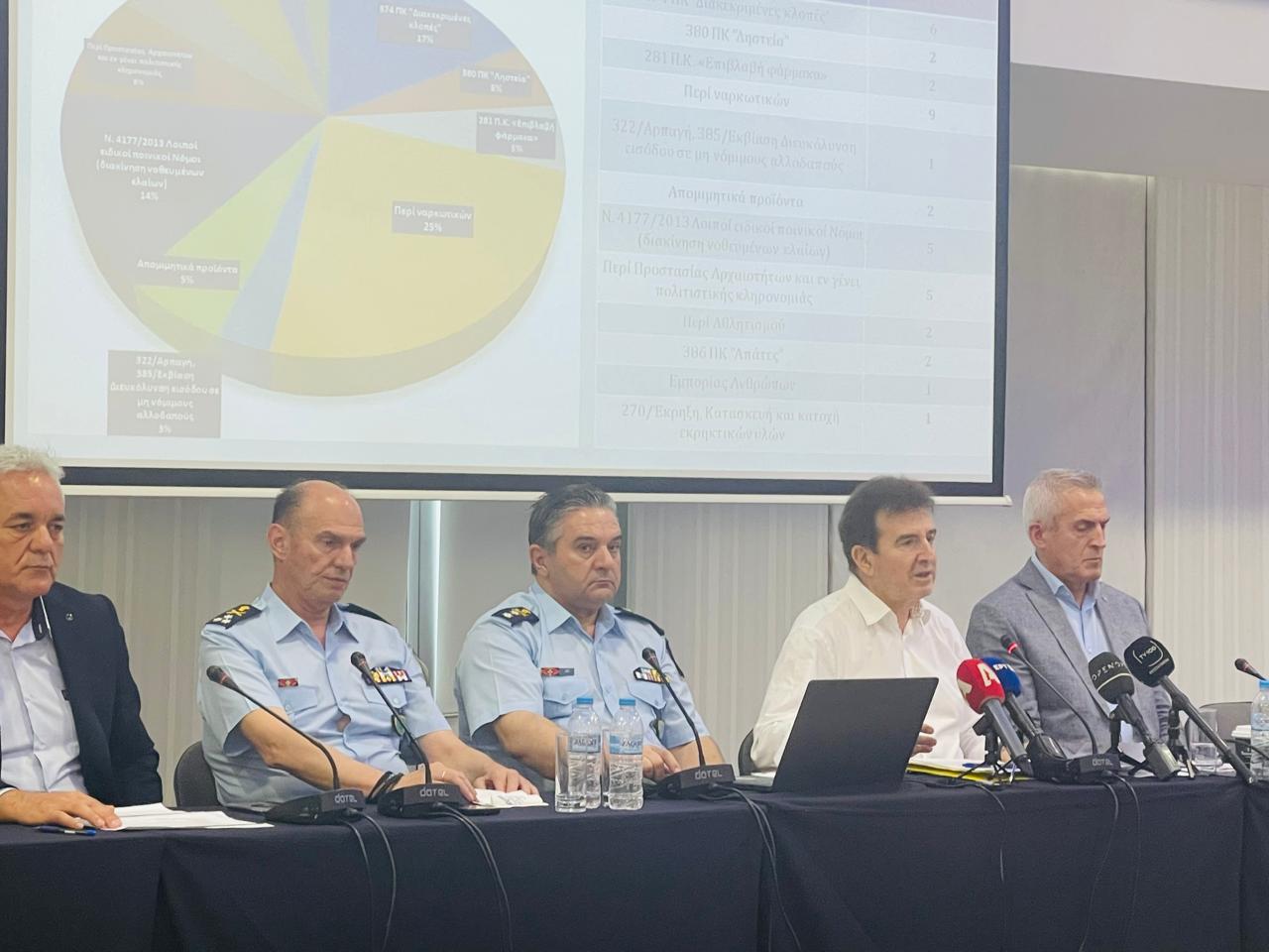 Ο επικεφαλής της Υποδιεύθυνσης Αντιμετώπισης Οργανωμένου Εγκλήματος Βορείου Ελλάδος, Αστυνομικός Διευθυντής Αριστείδης Μίντζας παρουσίασε τα στατιστικά στοιχεία των δράσεων της Υπηρεσίας το πρώτο εξάμηνο του 2025 τονίζοντας ότι, «εξαρθρώθηκαν 38 εγκληματικές οργανώσεις, διαπιστώθηκαν 294 ποινικά αδικήματα, κατηγορήθηκαν 422 άτομα, συνελήφθησαν 282, ενώ εξιχνιάστηκαν 380 αδικήματα». «Αναδείχτηκαν μορφές εγκληματικών οργανώσεων, όπως αυτές που προέρχονται από την Τουρκία και πολλά οικονομικά εγκλήματα», ανέφερε χαρακτηριστικά. Αναλυτικά η παρουσίαση εδώ.