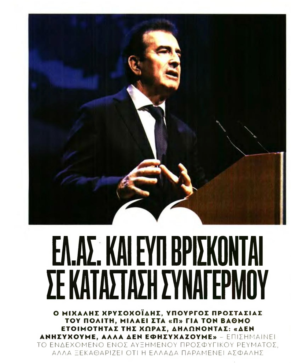 Η Ελλάδα είναι μία από τις πιο ασφαλείς χώρες της Ευρώπης, δηλώνει με κατηγορηματικό τρόπο ο Υπουργός Προστασίας του Πολίτη, Μιχάλης Χρυσοχοΐδης. Παρά ταύτα, μέσω των «Π» διαμηνύει πως δεν υπάρχει κανένας εφησυχασμός. Αντιθέτως, δηλώνει πως όλες οι αρμόδιες υπηρεσίες της χώρας είναι σε απόλυτη ετοιμότητα. Ο κ. Χρυσοχοΐδης παρουσιάζει αναλυτικά το σχέδιό του, αναφέρεται στις ενδεχόμενες μεταναστευτικές ροές λόγω του πολέμου, αλλά και στις στενές σχέσεις με τις υπηρεσίες των άλλων κρατών για να υπάρχει η μέγιστη δυνατή πληροφόρηση, που είναι, όπως λέει, το «όπλο» για την εθνική ασφάλεια.